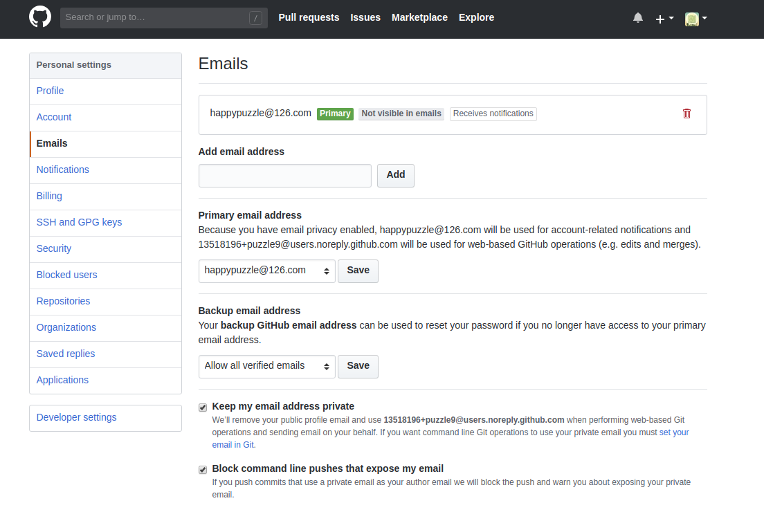 We’ll remove your public profile email and use 13518196+puzzle9@users.noreply.github.com when performing web-based Git operations and sending email on your behalf. If you want command line Git operations to use your private email you must set your email in Git.