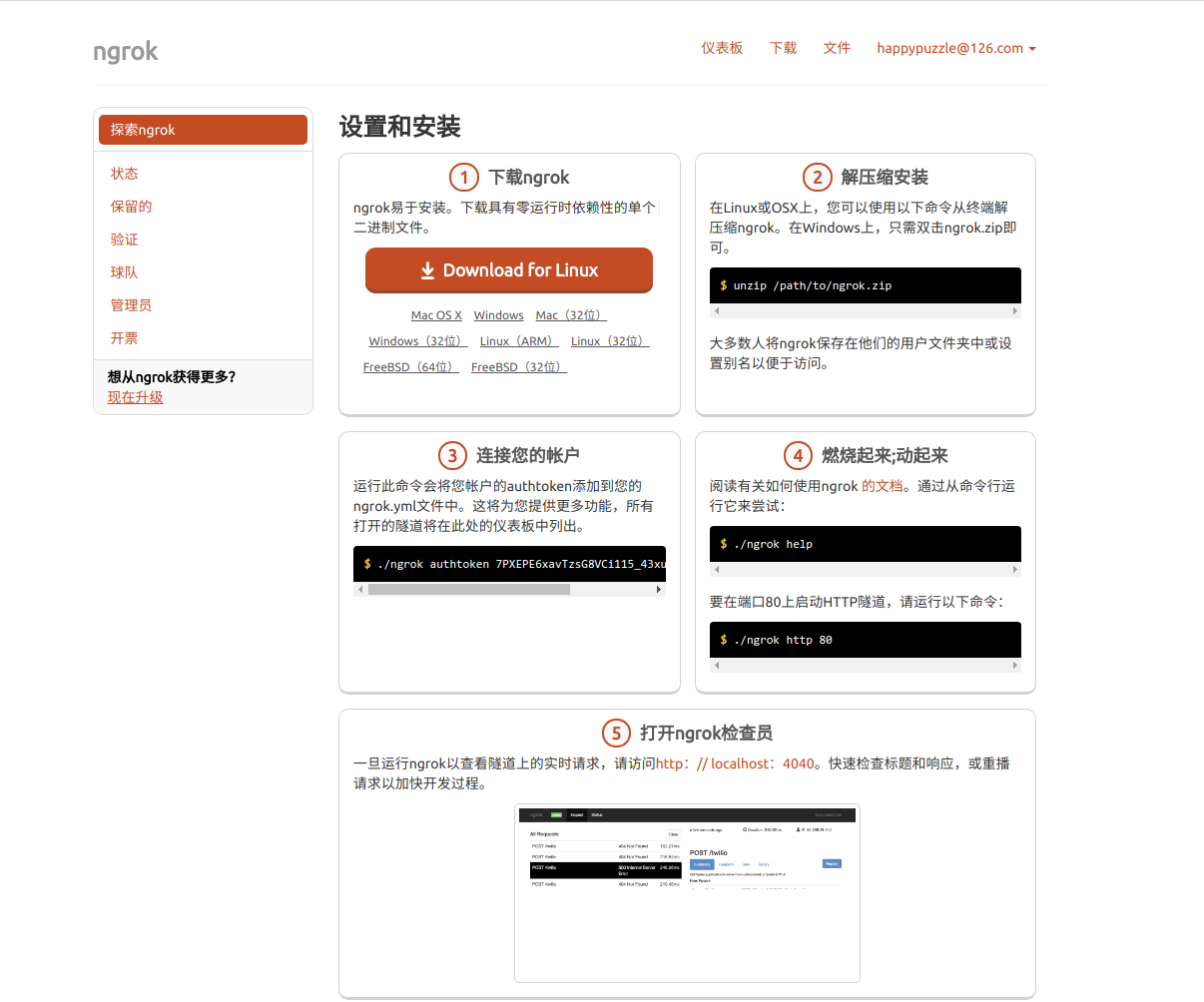 注册完成后 再到 https://dashboard.ngrok.com/get-started 看着这个文档来操作吧