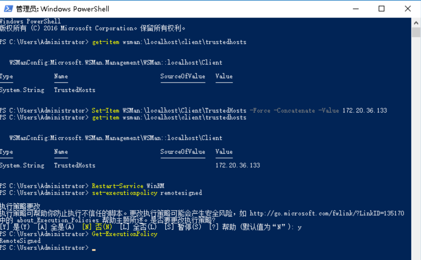 配置 win 1 2 3 4 5 6 7 8 9 10 11 12 Set-Item WSMan:\localhost\Client\TrustedHosts -Force -Concatenate -Value 172.20 .36.133 get-item wsman:\localhost\client\trustedhostsRestart-Service WinRMwinrm enumerate winrm/config/listener set-executionpolicy remotesignedGet-ExecutionPolicy